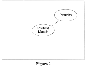 In dit voorbeeld is gekozen voor "toestemming" (permits) omdat gemeentes om veilgheidsredenen beperkingen kunnen opleggen aan demonstraties, met name bijvoorbeeld v.w.b. tijdstip en plaats. Je kunt niet zomaar snelwegen en spoorwegovergangen blokkeren, etc. In dit stadium gaat het niet om het oplossen van het probleem, alleen maar om het vaststellen dat het probleem er is. Vervolgens zo doorgaan, met zoveel mogelijk zaken als je maar kunt bedenken. Wel kort zijn. Slechts een of twee woorden gebruiken om een probleemgebied aan te geven. Ook nog geen probleem maken van netheid of uitgummen. Het gaat er nu om dat het denkproces gestimuleerd wordt. Alles kan nu belangrijk zijn. Prettig is hierbij ook input van collega's, etc., ook al zijn die geen specialist op dit onderwerp. Hun (andere) gezichtspunten voegen juist waarde toe. (fig 3)